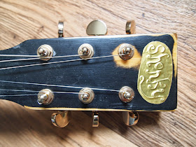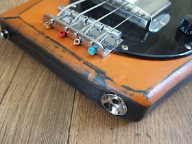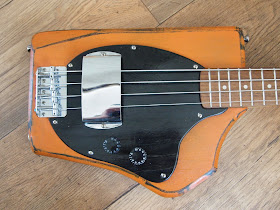 Everything on it apart from the strings and the glue, paint and solder of course, is recycled. Even the pots and wires. The knobs are of an old hifi.and the machine heads are counter fit Grovers which work ok but are not the quality of genuine ones.