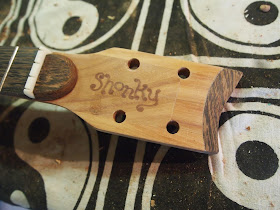 Also on the table is the second fire wood special. This one is based around an acoustic guitar neck I bought of ebay. When I got it I thought I had made an error as it was a right mess but always up for a challenge It's a bit more complex and refined than the first Firewood special but I am still building it to be a slide guitar 6 strings and I am trying out ernie ball beefy slinky (11 - 54's) for extra growl in open D.