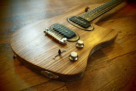 Anyway I have now built the first commercially available model which is a bit more simple with a solid and heavy Ash Body (none of that poncey swamp ash!)  22 fret flame maple and rosewood neck