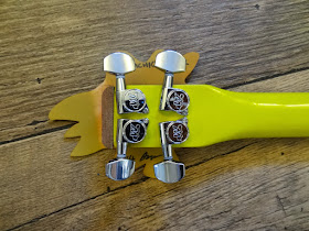 John is right handed so I moved the controls to the lower side. I also went for green chicken head knobs to match the green painted fret markers. .