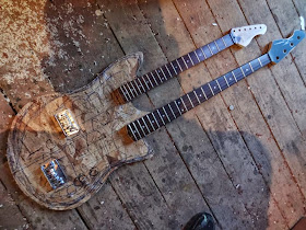 The doner guitar neck. An old neck with a chopped headstock and rusty old open geared machine heads. I added an extra piece of maple and shaped it to my headstock design. The bass neck doner was a new Peavey neck which I reshsaped the headstock to match.