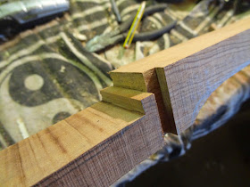 This the sort of neck joint I make. The vertical slot is for the wall of the box to slot into and there is a little shelf which hopefull the lid will rest on. Further adjustments will have to be made throughout the process. I mostly always have a gap between the neck and lid as I feel it lends more of a semi acoustic tone.